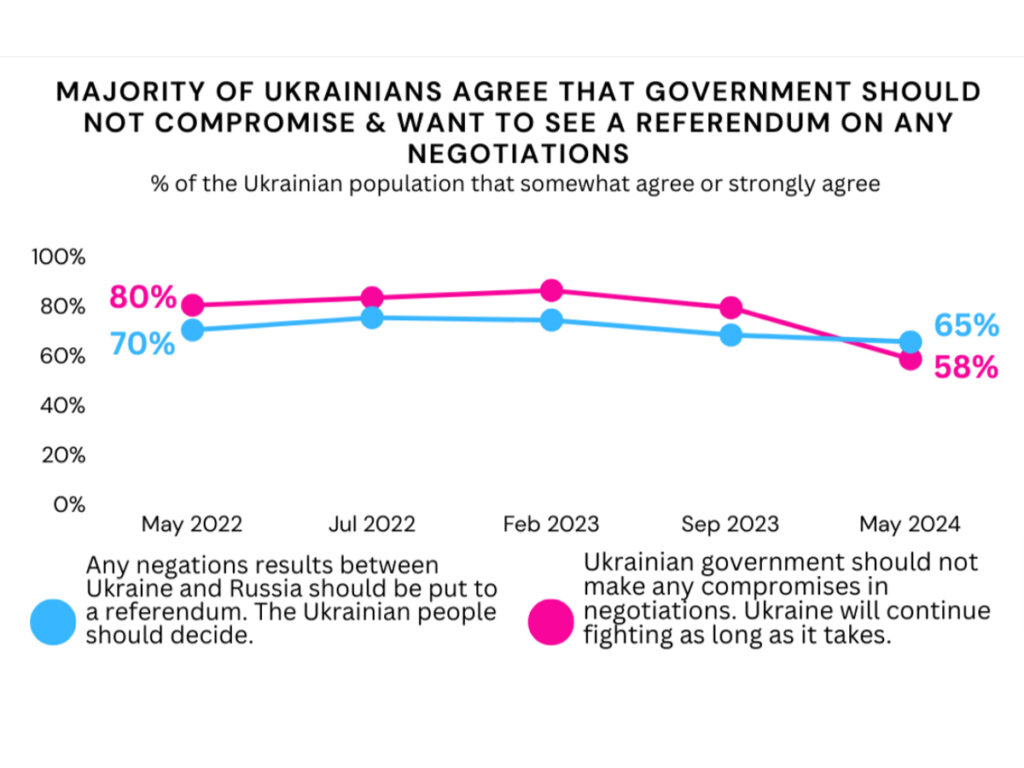 Більшість українців (58%) згодні із твердженням, що «Українська влада не має йти на компроміси у переговорах. Україна продовжуватиме боротьбу, скільки буде потрібно» (30% не згодні). Частка тих, хто згоден із цим твердженням, знизилася за останні два роки (у травні 2022 року було 80%), проте все одно більшість українців підтримують продовження боротьби стільки, скільки це необхідно. При цьому 65% згодні із твердженням, що результати можливих переговорів із Росією мають бути винесені на референдум (25% не згодні).