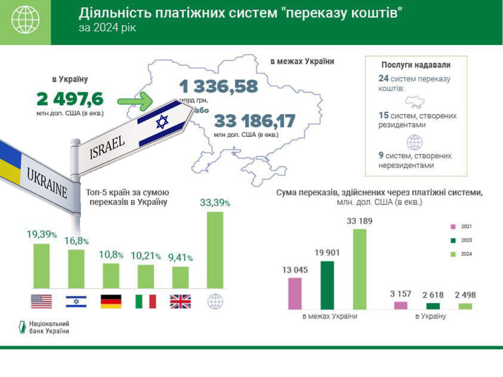 Перекази з Ізраїлю через системи грошових переказів у 2024 році склали 16,80% від загального обсягу, що вище показника 2023 року (15,59%).